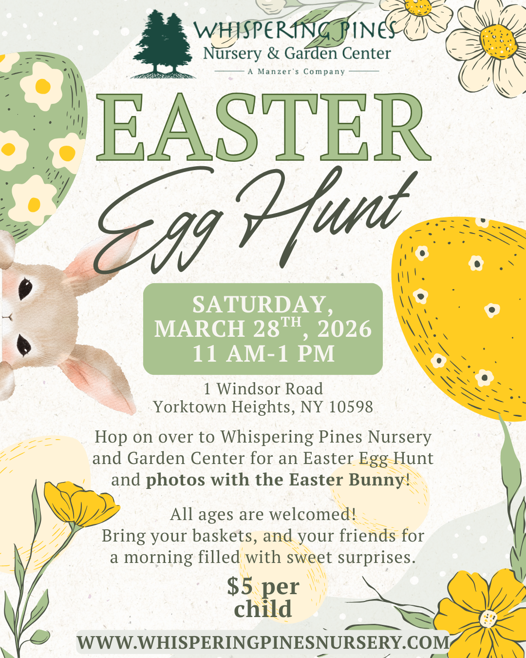 Hop on over to Whispering Pines Nursery and Garden Center for an Easter Egg Hunt and photos with the Easter Bunny. Bring your baskets, and your friends for a morning filled with sweet surprises!